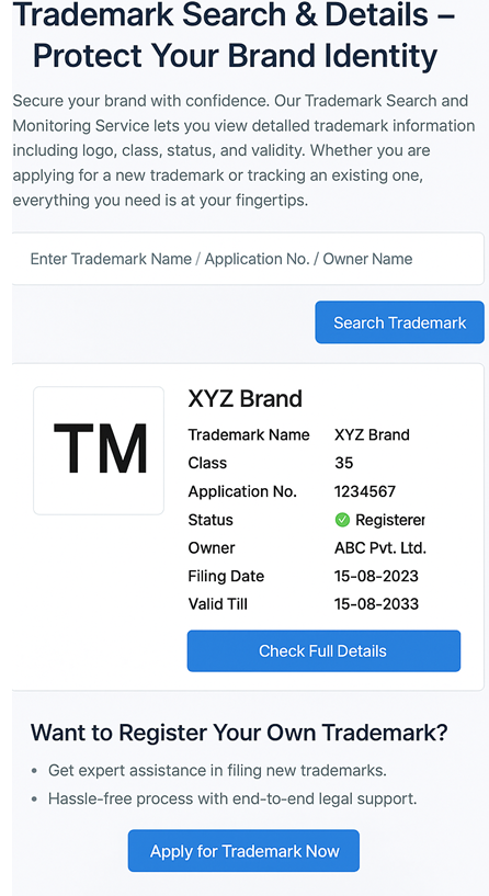 Secure your brand with confidence. Our Trademark Search and Monitoring Service lets you view detailed trademark information including logo, class, status, and validity. Whether you are applying for a new trademark or tracking an existing one, everything you need is at your fingertips.